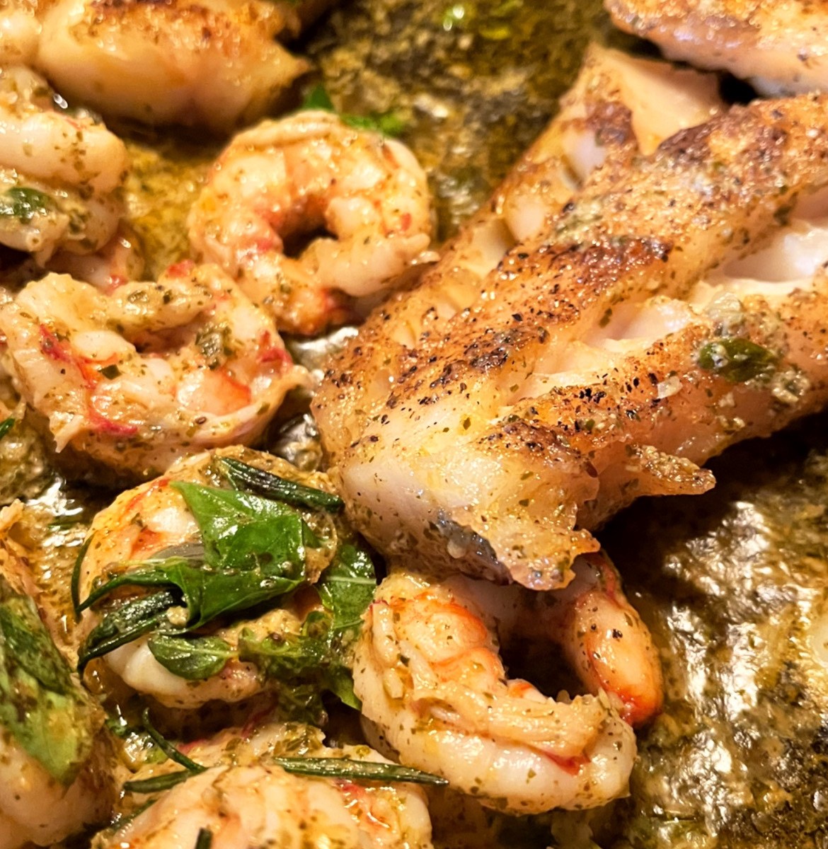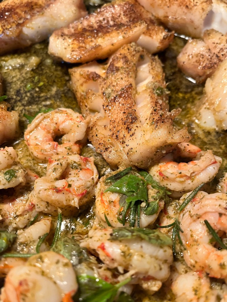 - Add 2 tbs butter and 2 tbs olive oil seasoned shrimp (same as Cod) in a saucepan. Cook on medium for 3 minutes.